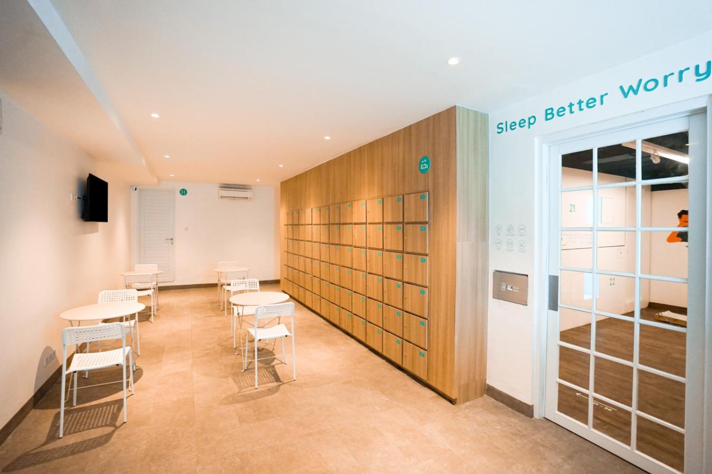 At the capsule hotel, every room has a seating area.